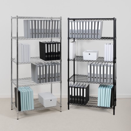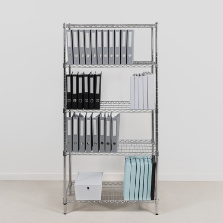 Ten regał idealnie nadaje się do magazynowania w sklepach, biurach, szpitalach i domach, a ponadto pełni funkcję dekoracyjną. Wytrzymuje obciążenie do 150 kg na półkę przy równomiernie rozłożonym ciężarze. Montaż bez użycia śrub pozwala na szybkie i łatwe zmontowanie regału. Dzięki starannemu wykonaniu jest to opcja zapewniająca bezpieczeństwo, trwałość i odporność. Ta powłoka poprawia również wygląd i właściwości produktu w każdym środowisku.
