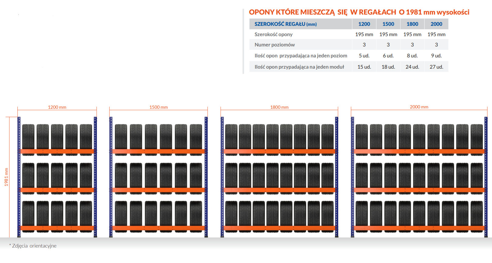 Liczba opon, które można umieścić na regałach o wysokości 1981 mm.