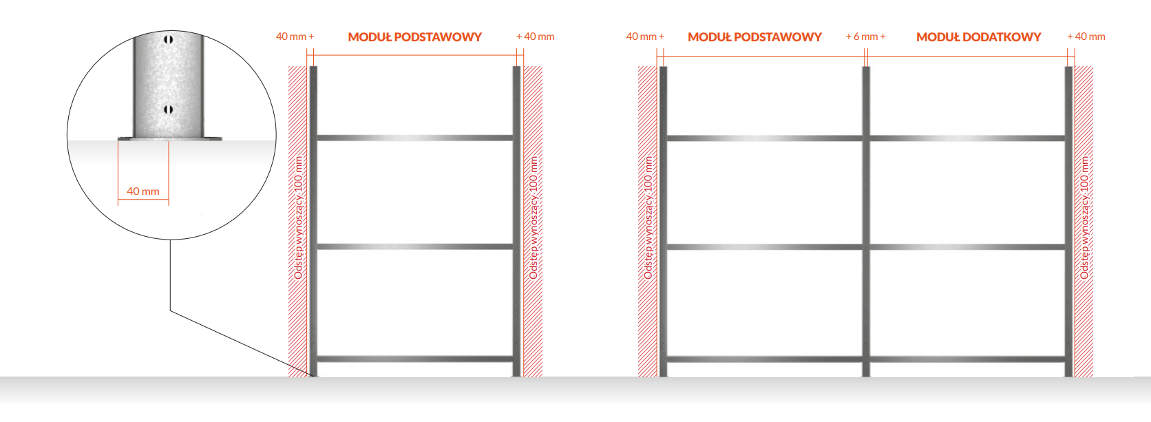 - Moduł dodatkowy: sklada sie z dwóch słupów i dowolnej liczby półek. Musi on być zawsze instalowany przy innym module, z którym będzie dzielił przylegajęce słupy, tak jak przedstawiono na rysunku.