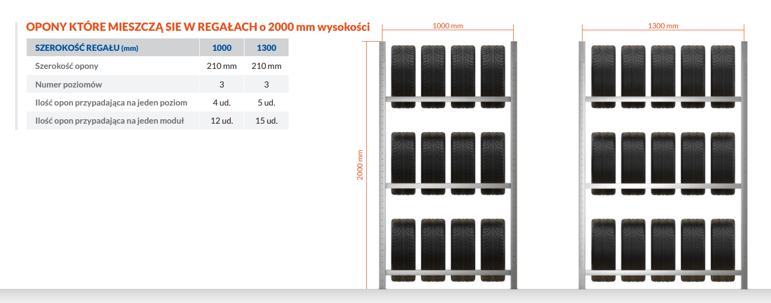 Liczba opon, które można umieścić na regałach o wysokości 2000 mm.