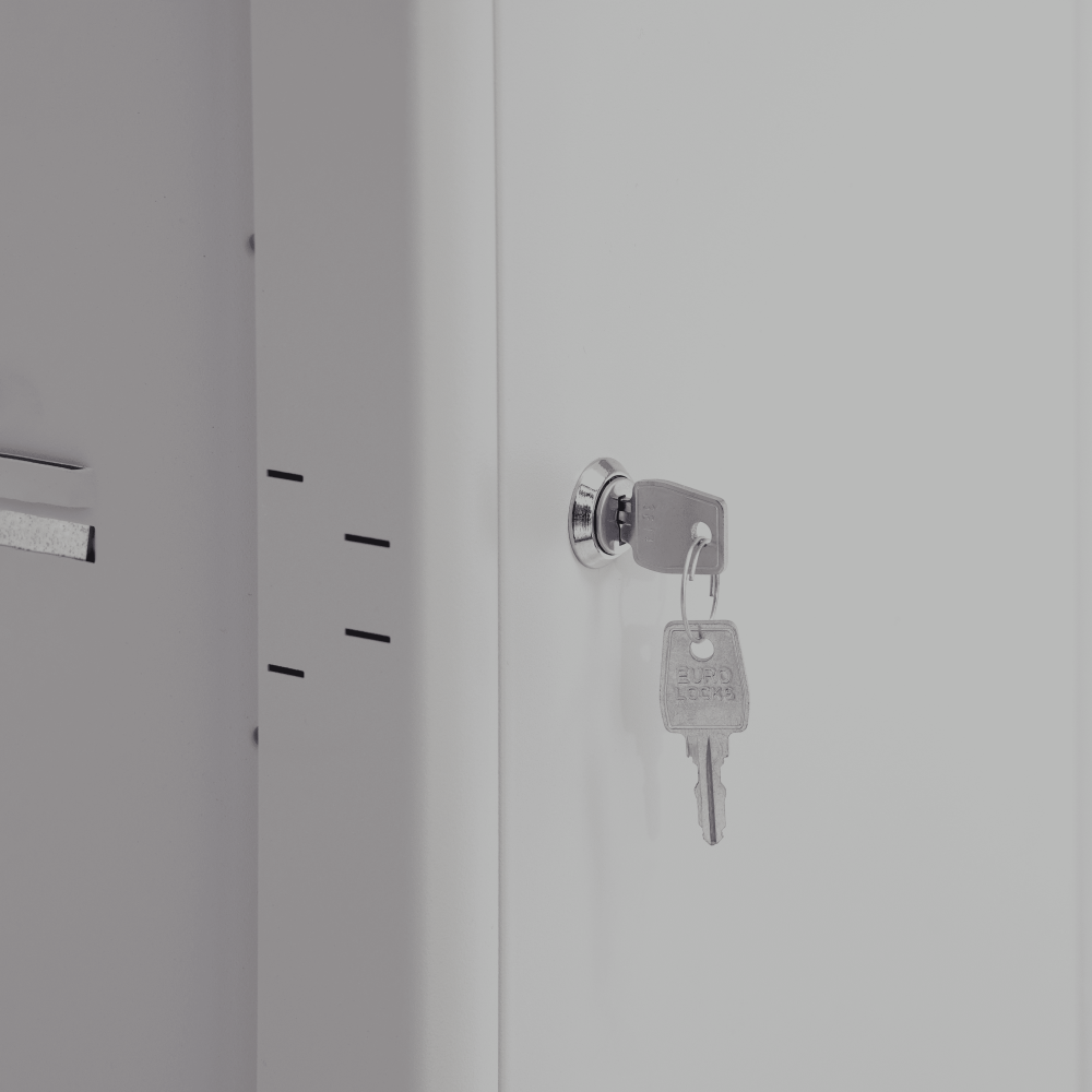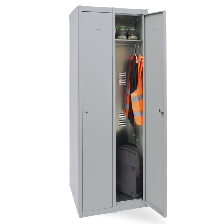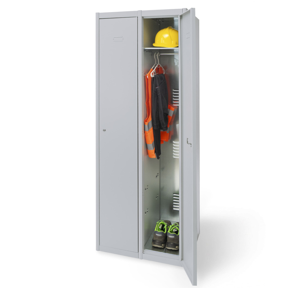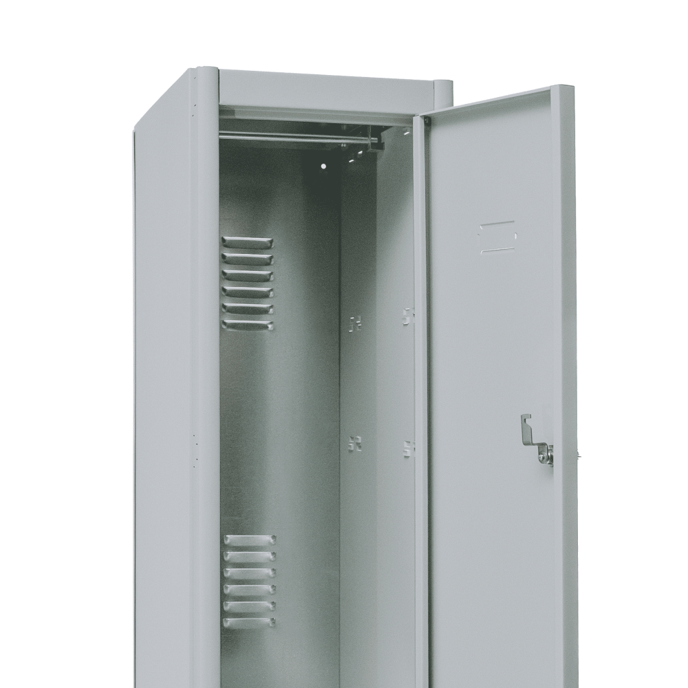 W zestawie znajduje się wewnętrzny drążek na ubrania, który zapobiega ich marszczeniu, oraz zintegrowana etykieta ułatwiająca identyfikację i utrzymanie porządku.System zamków z zamkami głównymi umożliwia efektywne zarządzanie dostępem za pomocą indywidualnych kluczy i klucza głównego. Dostępna jest również opcja zamka na kłódkę.